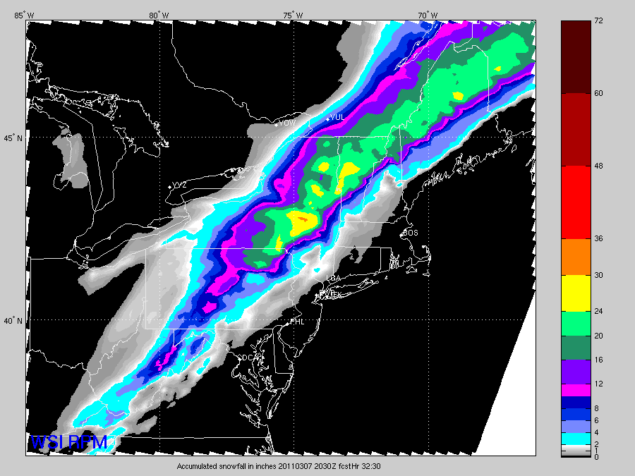 Tomorrow: Rain and snow comes to an end in the afternoon. Daytime highs will occur in the morning with temperatures falling or holding steady through the day, 40s south, upper 20s to low 30s north. Total accumulations of 20-30 inches, see image below.